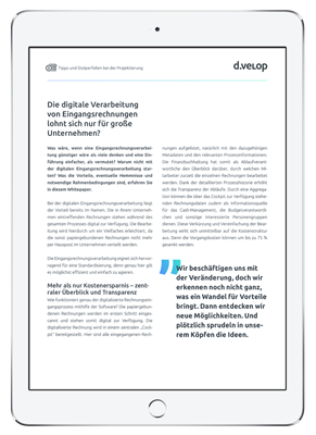 Was die Vorteile, eventuelle Hemmnisse und notwendige Rahmenbedingungen sind, erfahren Sie in diesem Whitepaper "Digitale Eingangsrechungsverarbeitung - Tipps und Stolperfallen in der Projektierung".