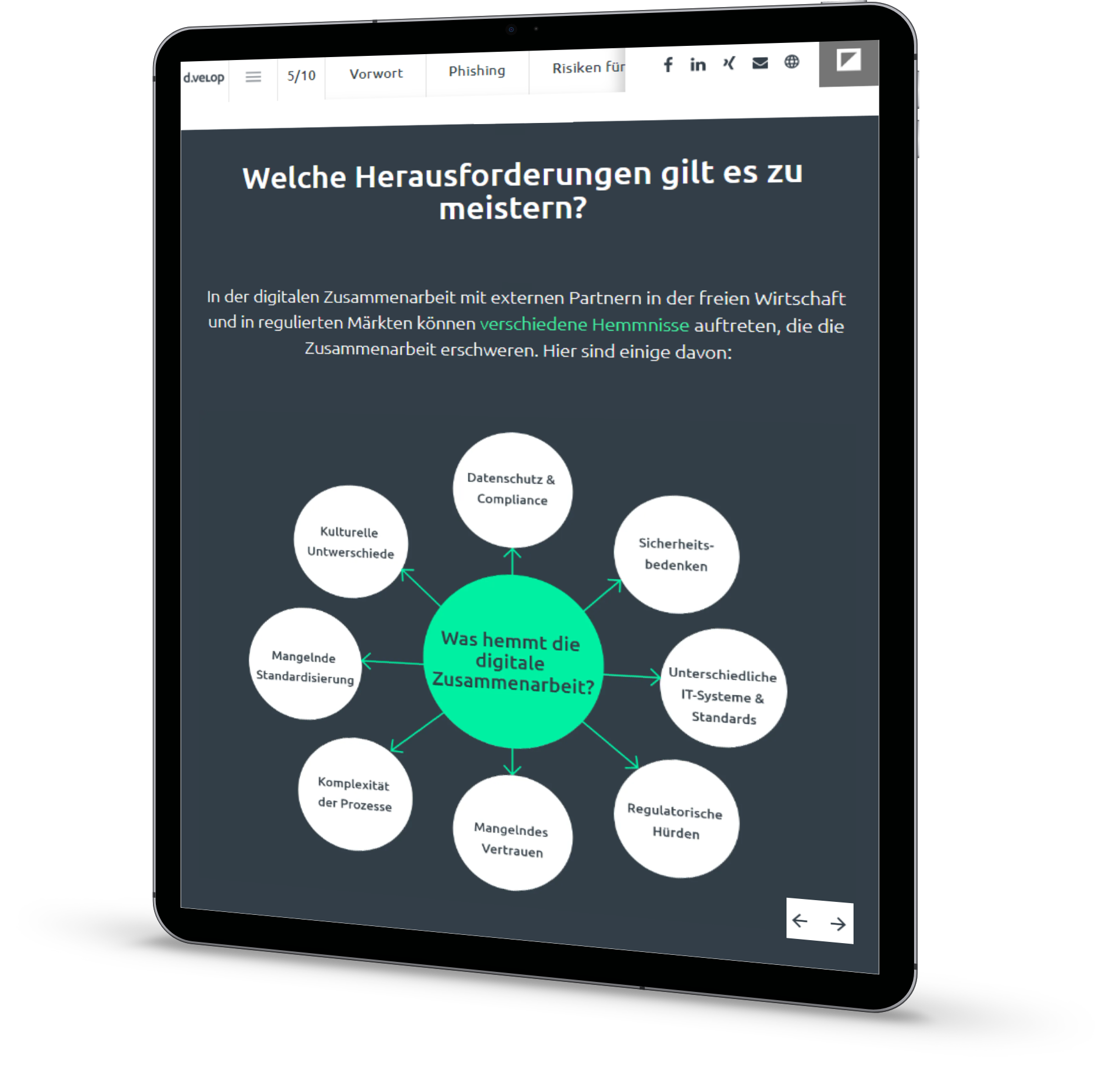 Mit d.velop trust spaces gelingt der ideale, organisationsübergreifende Dokumentenaustausch. Sichere Räume sind ideal für den Dokumententransfer und die Projektarbeit mit Externen geeignet – das gilt für Unternehmen im Allgemeinen und für Organisationen in regulierten Märkten im Speziellen. In diesem Whitepaper werden wir uns eingehend mit den Möglichkeiten befassen, die d.velop trust spaces Organisationen im Cyberraum bietet, und die Funktionen und Vorteile beleuchten, die ein gutes Rüstzeug gegen Cyberbedrohungen bieten.